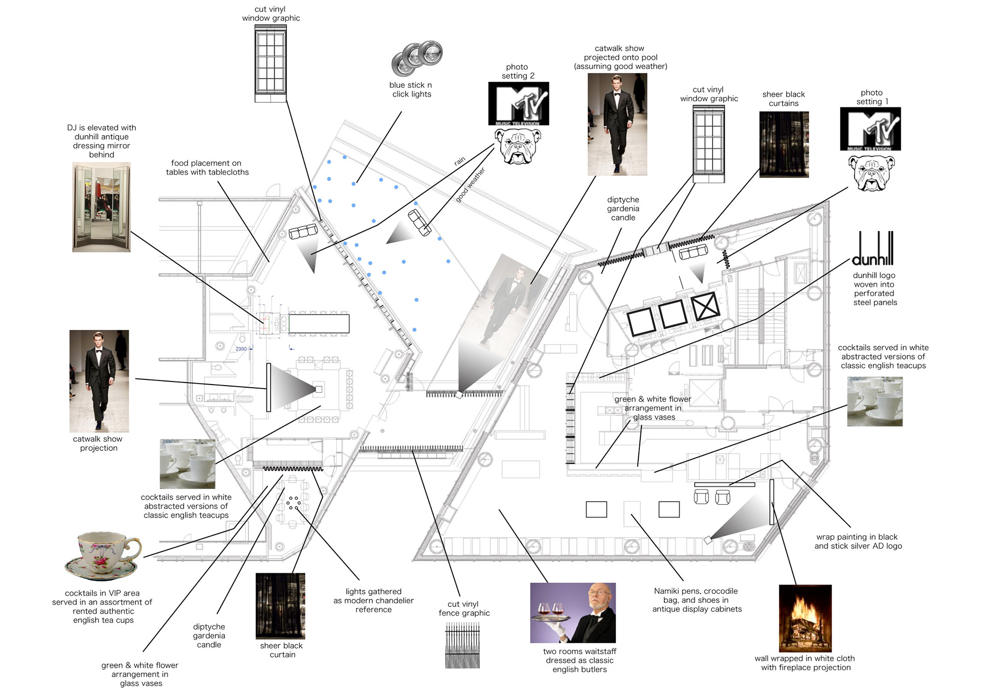Rounding out the event were projections of B&W movies and Dunhill catwalk collections and a custom built DJ booth that framed the DJ in an antique 3-piece parlor mirror.